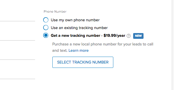 2. Scroll to the bottom where it says “Phone Number” and select “Get a New Tracking Number”. Click on “Select Tracking Number” and the purchasing modal will appear.