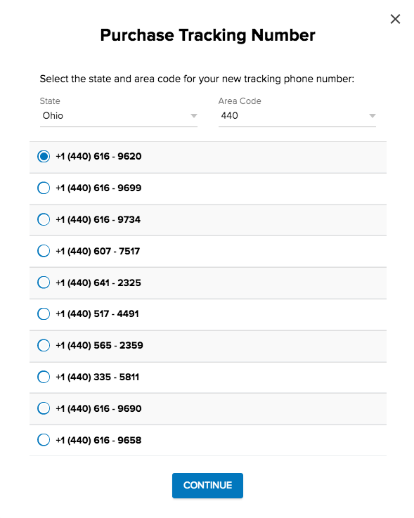 Once you click on “Select a Tracking Number” during the campaign creation or “Add New Number” on the Tracking Tab, the purchasing modal will open and you’ll be guided through the process of selecting a number and purchasing it.
